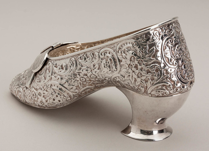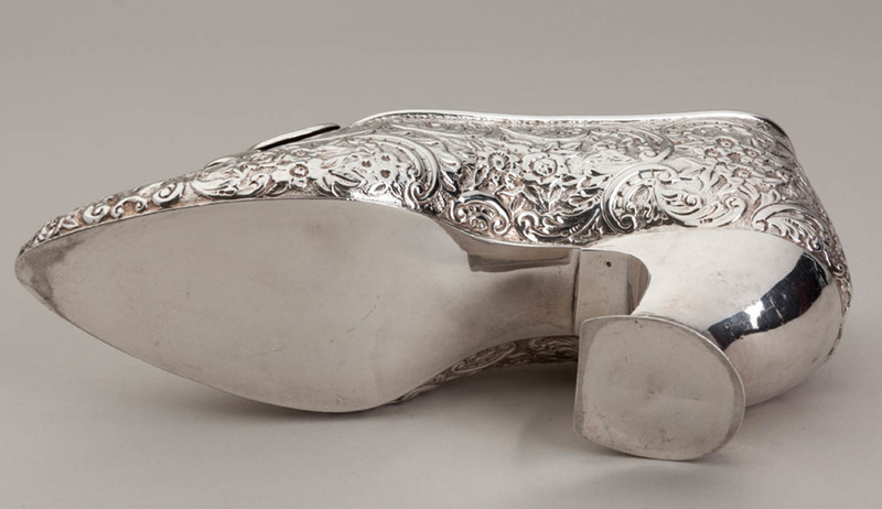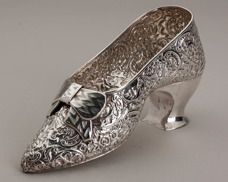 Description: An antique sterling silver shoe, we hesitate to call it miniature as it is almost real size, perhaps a child's size, we assume originally intended as a sugar bowl. It is in the traditional form as silver miniature shoes, a replica of a 16th century court shoe, profusely decorated with flowers, leaves and scrolls, with a bow on the front, and shaped heel at the back. it has been well preserved in its original box (silk and velvet, a good quality box), the box reads "Cutler Jeweller Jersey". The shoe is clearly hallmarked, the hallmarks hidden in the decoration but clearly legible, the base of the heel is also hallmarked. JF Cutler was a prestigious Jeweller who operated from 2 Queen's Street (still a jeweller today trading as Goldsmiths), he is known to have been there between 1900 and 1920.