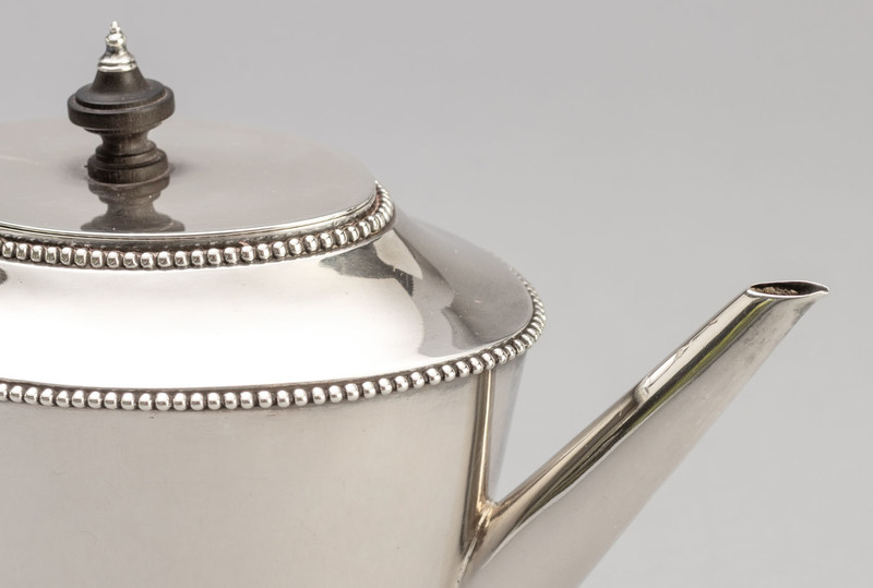 Description: A beautiful Dutch antique silver bachelor teapot, made in Amsterdam in 1802 by master silversmith Jacob Hendrik Stellingwerff. The teapot is a very classical design, navette shaped with a plain body with beaded rims, and straight "oil can" style spout. The handle is a plain wooden C scroll shape, with unusual but beautiful silver bands to attach the handle, this is a feature we have not seen before. The oval lid with a turned wooden baluster finial, securely held in place with a silver nut, fits very securely and snugly into the teapot. The teapot is quite small, hence our description as a bachelor teapot, it will probably only hold 2 cups of tea. The quality of the teapot is very pleasing, clearly Stellingwerff was a highly competent silversmith. The teapot base is clearly hallmarked with 5 hallmarks, these include a very clearly struck I.H.S makers mark for Jacob Hendrik Stellingwerff. The Amsterdam city mark and crowned lion rampant (Province of Holland 934 standard mark, so purer than sterling) marks have slight wear but are still clearly visible. The date letter T in circle for 1802 is very clear, as is the crowned O duty mark. This crowned O mark was used during the Kingdom of Holland period (1807-1812), it was struck on older items when resold to indicate no duty had been paid (also called re-examination hallmark). The rim of the lid also has the crowned O hallmark, this is the only hallmark on the lid. Jacob Hendrik Stellingwerff (1773-1823) originally worked in Zwolle, he moved to Amsterdam in 1794 to work for his uncle. He established himself as an independant silversmith in 1801, so this teapot is one of his earlier pieces. He was an important supplier to the firm Bennewitz & Bonebakker (source RKD website, Netherlands Institute of Art History). His father, brother and son were all silversmiths, and his wife carried on the business after his death. His work has been preserved in a number of different museums, including the Rijksmuseum and Boijmans Van Beuningen in Rotterdam.