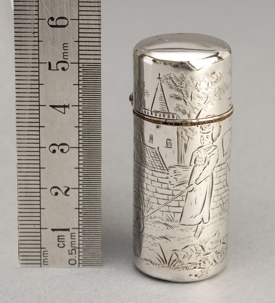 Description: A Sampson Mordan silver scent bottle, beautifully engraved with Kate Greenaway images, a girl pulling a smaller girl in a wheeled cart, and another capped girl walking towards a gate, all in front of a brick wall, with a church with spire in the background. The bottle is clearly hallmarked on both the base and the lid. The glass bottle inside is loose and can be removed, it fits exactly into the hole, so we are not sure if it is original or a later replacement. Kate Greenaway was a Victorian artist and writer, her 1879 book "Under the Window" a collection of simple, perfectly idyllic verses about children, was a bestseller. "Kate Greenaway" children, all of them girls and boys too young to be put in trousers, were dressed in her own versions of late 18th century and Regency fashions: smock-frocks and skeleton suits for boys, high-waisted pinafores and dresses with mobcaps and straw bonnets for girls - source Wikipedia. Sampson Mordan became famous for producing high quality, innovative novelty items, many of which are highly collectable today. The firm worked between 1823 and 1941. The motto of the Sampson Mordan company was "Quality lives when price is forgotten" - Sampson Mordan & Co booklet, 1986.