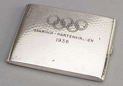 Description: A German sterling silver cigarette case, made in 1936 to commemorative the Winter Olympics held in Garmisch-Partenkirchen, Germany, which at the time was under Nazi rule. The Cigarette case in the usual rectangular shape, with a slight curve on both sides, with a push button clasp. The case is planished (hand hammered) in Arts & Crafts style on both sides, and is very pleasing quality, it is a pleasure to hold and use. The front is engraved with the 5 Olympic rings, with "GARMISCH - PARTENKIRCHEN 1936" below, this is filled with black enamel, note the slight enamel loss on 3 letters. The interior is gilded, and is engraved with previous owners name "T. BOSCH". The case is clearly hallmarked with 4 hallmarks, all on the clasp, they include German moon and crown, makers mark LW entwined in a shield for Lutz & Weiss, 925 and STERLING standard marks. The winter Olympics were held in February 1936, this was followed by the summer Olympics in Berlin in July 1936 (the last time the winter and summer Olympics were held in the same country). Although efforts were made to boycott the event due to Germany's anti-semitic regime, no member nations boycotted, and 49 countries participated. 17 winter events were held, including a number a ski and skating events, but also bobsleigh and ice hockey. Norway won the overall winter games with 7 gold medals, Switzerland won the bobsleigh, and Great Britain beat Canada in the ice hockey finals. We are not sure if this cigarette case was sold at the event as a souvenir, or if it was perhaps a corporate gift, for example a gift to the organizing committee or visiting dignitary. Lutz & Weiss Silberwarenfabriek was founded in 1882 in Pforzheim.