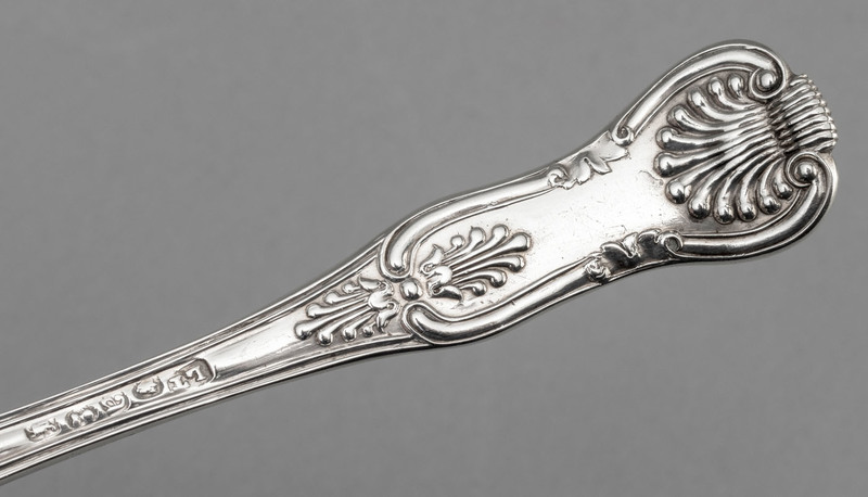 Description: A rare Cape silver dessert spoon in the Kings pattern, made by Lawrence Twentyman. The spoon is excellent quality, as is usual for Cape silver Kings pattern, and has a very pleasing weight. The Kings pattern is double struck (on both sides), and this spoon has not been engraved. The spoon has 5 clear hallmarks, makers mark LT and 4 pseudo hallmarks, all individually struck. They include pseudo lion passant, Georgian duty mark, date letter a and crowned leopards head town mark, this is mark 135 in the book Cape Silver by Stephan Welz. Cape silver Kings pattern was only made by 2 silversmiths in the Cape, Twentyman and Fredrik Waldek, who took over Twentymans' workshops when he left the Cape for India.