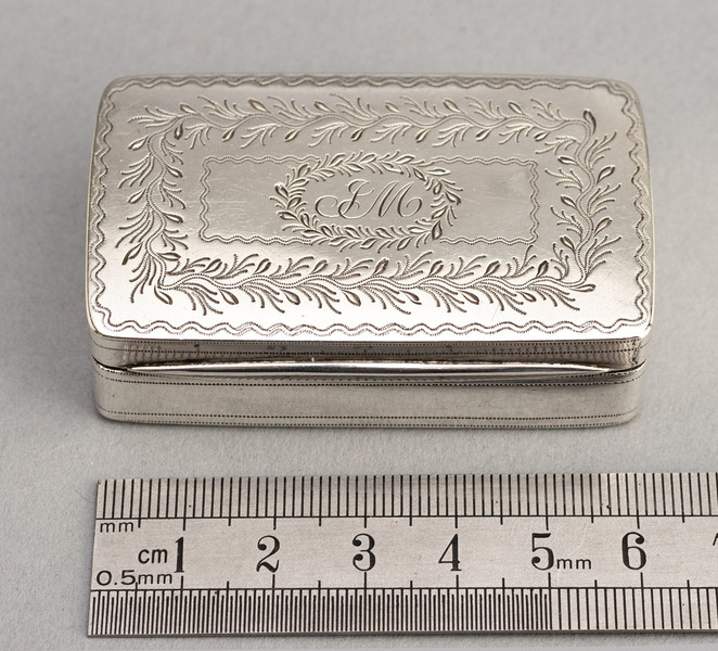 Description: A Cape silver snuff box, decorated with typical Cape silver engraving, struck twice with an unidentified makers mark that requires further research. The snuff box is rectangular, with a plain thumb-piece and gilded interior. The box lid is beautifully engraved, original owners initials JM in script, surrounded by oval wreath. The wreath is repeated in rectangular form, with the typically Cape wavy engraved border repeated twice, on the border and around the wreath. Careful examination of the engraved wreath shows the wavy leaves and foliage branch off from the wavy engraved design. The base is engraved with the same wavy borders, with a central rectangular cross hatch design, this looks similar to engine turned engraving but was clearly done by hand. The sides of the snuffbox have engraved bands (a series of dots), this is also present on the base. Similar engraving on Cape silver snuff boxes can be seen in the book "Cape Silver" by Stephan Welz, page 88 figure 1 by Johannes Combrink, and page 89 figure 1. by Lawrence Twentyman, where Welz states "extensive floral engraving on the lid is unusual for a Cape snuff box". The box is hallmarked with 2 makers marks only, on lid and base, the mark appears to be R.V, with 2 additional dots before the R. The punch also has a clear indent above the R, which obscures the top of the R. The V is very clear, the R is slightly blurred, but visible enough to be reasonably sure it is an R. No RV makers mark has been recorded in the literature, but it could be Richard Vippond (Welz page 142), who worked as a Jeweller, etc and Retailer in Cape Town between 1830 and 1857. He was born in Cork, Ireland in 1804, and married Anne Bridges in the Cape in 1827. His son William Arthur Vippond also worked in the Cape as a watch and clockmaker (circa 1853), it is believed the Vippond family then emigrated to Australia in the mid 1850's. Given that Vippond worked for 27 years retailing Jewellery etc, it is probable he also sold snuff boxes, and could have had his own makers punch. Given the clear V surname hallmark, we have also considered if this mark could belong to one of the Vos family of Silversmiths, the most likely candidate being Johan Hedrik Vos (Welz mark 150), whose punches became worn over time, but we think given the dots in the hallmark, and indent to punch, this is unlikely.