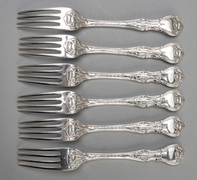 Description: A rare set of 6 Victorian silver dessert forks, in a pattern of an unknown name that is not recoded in the book Silver Flatware by Ian Pickford (a book we highly recommend). The pattern is derived from Kings pattern, but with a small shell at the top, and has a series of scrolls around an architectural feature, and a very intricate heel where the handle joins the tines. It is similar in style to both the Albert and Victoria patterns. It is also similar to another "Pattern of Unknown Name", recorded by Pickford on page 151, Figure 239, which Pickford describes as "French inspired mid-nineteenth century pattern, the design registered in 1852, many features similar to the Albert Pattern", this pattern is also by Hayne & Cater. The forks are double struck, no engraving is present, and the quality and condition is very pleasing. All 6 forks are clearly hallmarked, with some wear to some of the makers marks. All 6 forks are also stamped with the British Registry design number and date chart diamond, which rarely occurs on silver flatware - class I for metal, date letter D for 1852, and letter B for October visible on some of them, partial wear on some of the diamonds. The business of Hayne & Cater was established in 1758 by Thomas Wallis, who was succeeded by his son (also Thomas). Jonathan Hayne (father of Samuel) then joined, Samuel joined his father in 1836, then Dudley Cater (a former apprentice) joined in 1848. Hayne and Cater clearly prospered, as they supplied many leading retailers and have left behind some impressive silver. The business was declared bankrupt in 1865 after Cater retired in 1864. This particular unknown pattern is clearly a rare pattern, we have only been able to trace 2 other examples of it (including an impressive soup ladle on the Tim Spearing website). Given we know that Hayne and Cater registered 2 new flatware designs in 1852, we assume they planned to expand their business by introducing innovative designs. Unfortunately it appears that the designs were not a success, as they were only produced for a very short period (1853), and very few examples are known today, so we can assume very few were made.