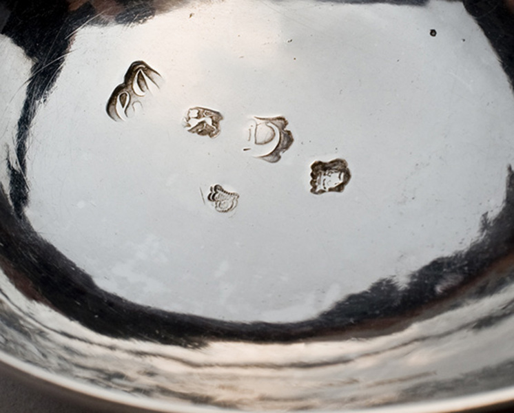 The hallmarks are clear, but the date letter e and makers mark GJ are partially struck, but still discernable. The ladle has a 5th hallmark, the Dutch script letter I, which is a tax mark for silver items in the Netherlands not bearing an older tax mark. This indicates the ladle passed through the Netherlands at some stage.