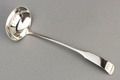 A Scottish Provincial silver Toddy ladle in the Oar pattern, which is a scarce variant of Fiddle pattern (Fiddle without shoulders), only found in Scotland (Pickford, Silver Flatware, pg. 111). The ladle was made by Peter Lambert in Aberdeen, and is engraved with original owners initials RMR in script. The ladle has 3 hallmarks, makers mark PL between 2 thistles, these marks are well struck but blurred, so we assume the punches were worn. The thistle punch has a noticeable indent on the left hand side. Peter Lambert was born in Aberdeen, as was admitted to the Hammermen in 1804. He left Aberdeen in 1813, and subsequently moved from town to town looking for work, he is known to have worked in Dundee, Montrose and Berwick, and had spoons assayed in Newcastle and Edinburgh (Aberdeen Silver by Michael Wilson, page 60, a book we highly recommend).