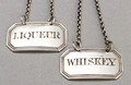 An interesting pair of Victorian silver boudoir labels, engraved for WHISKEY and LIQUEUR, notable for their small size. The labels are rectangular with cut corners, and have a double reeded edge, both with their original chain. The engraving is clearly done by hand, a little crude when studied under a magnifying glass, so not a master engraver. Both labels are clearly hallmarked for Birmingham 1839, note the Georgian (male head) duty mark is still being used, even though Victoria became Queen in 1837. The Jacksons hallmark book edited by Ian Pickford shows the new Victorian duty mark in use from 1838, so the use of the Georgian duty mark in 1839 is an anomaly. Makers mark GU for George Unite is clear on one label, and partially worn on the second label. George Unite served his apprenticeship under Joseph Willmore, he registered his mark in 1832 and was joined by his sons in 1873, he died in 1896. Our description of these labels as boudoir labels is thanks to John Salters excellent book "Boudoir Labels 1753-19...