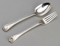A rare matching spoon and fork in the Old English Military Bead & Shell pattern, a pattern that is not recorded by Ian Pickford in his book "Silver Flatware". They are dessert size, so probably made for a child, as a Christening present. The base pattern is large bead (used in 19th century, fine bead was 18th century), but has been supplemented with the Shell pattern (concave on one side and convex on the other). This combination of bead and shell pattern is not recorded by Pickford and is not shown in the Chawner pattern book of 1875 (Pickford, Silver Flatware, pages 217-220), so must be described as rare. What adds to the rarity of this pair are the 2 small scrolls instead of shoulders, hence the Military designation, which has been recorded with Husk, Thread and Shell patterns, but not with Bead (Pickford page 230). The pair are double struck, and have engraved owners initials MH is script. Both are clearly hallmarked, including makers mark GA for Chawner & Co, who were the leading manufactures of silver ...