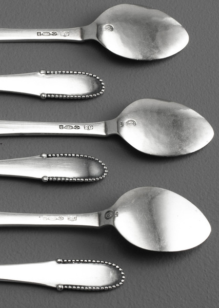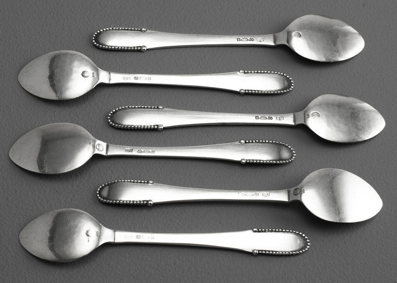 Description: A rare set of Georg Jensen Beaded pattern ice cream (or sorbet) spoons (6), made in very limited quantities. The spoons are small teaspoon size, and have flat oval bowls for eating ice cream, the bowls are planished (hand beaten marks, hand forged). The beaded pattern (Kugle in Danish, Jensen pattern # 7) has a beaded pattern around the lower edge of the handle, it was designed by Jensen himself in 1916, described as "an elegant composition, that remains contemporary in design while imparting a timeless quality" - Georg Jensen, Tradition of Splendid Silver, page 267. All 6 spoons are hallmarked with Danish marks GJ in circular bead with 925 standard mark, and English import marks for 1925, with importers mark GS for George Stockwell & Co, (imported Jensen silver between 1909 and 1931).