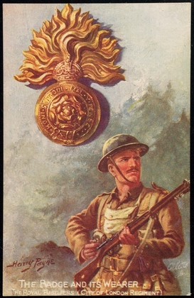 Description: A fabulous quality Royal Fusiliers City of London Regimental sweetheart brooch, with 77 diamonds set in Platinum and 9 carat gold. The badge consists of a Fused (or smoking) Grenade, above a Tudor rose enclosed by Royal Garter, with motto "Honi Soit Qui Mal Y Pense", translated "evil to him who evil thinks", surmounted by Royal crown. The grenade has 63 diamonds, the rose has 11 diamonds, gold lettering surrounded by blue enamel, and the crown has 3 diamonds and red enamel. The pin, clasp and hinge are all solid 9 carat gold, the diamonds are set in platinum. The brooch is hallmarked "9Ct" for 9 carat gold, and "PLAT" for platinum. Platinum usage in high end quality jewellery only commenced at the turn of the 20th century during Edwardian times, it's usage had died out by World War II due to expense, so we can date this brooch to either the Boer War or World War I. The Royal Fusilier (or 7th Regiment of Foot) regiment dates back to 1685, and has seen service in the American War of Independance, Napoleonic Wars, Crimea War, Boer War and both Great Wars, its members have earned 22 Victoria Crosses. It lost 22 thousand men during World War I, as commemorated in it's memorial on Holborn Street, London (see picture). Note - This brooch is accompanied by an original drawing on card by the jeweller. It is also accompanied by a valuation certificate from Gemlab, confirming authenticity of diamonds (0.53 carats, single cut, G/H colour, VS/SI clarity), and 6.79 grams of 9 carat yellow gold and platinum, replacement value R 32300.