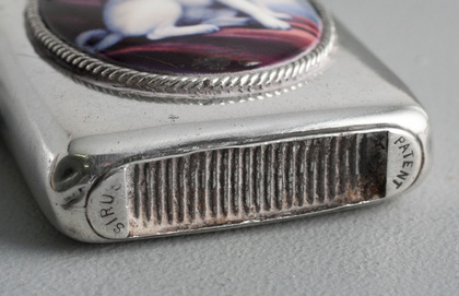 Description: A lovely Victorian silver and enamel vesta case, featuring a seated pug on a red chair, with sky and trees in the background. The enamel is oval, with a twisted rope border, the vesta is rectangular with rounded corners, and a safety ring for connection to a chain. This is a substantial vesta case, larger than the traditional size, and quite heavy in the hand. The striker plate on the base is stamped "SIRUS PATENT", which we have observed on other vesta cases by Horton & Allday, it is a nice size and oval in shape, so easy to use. The rim is clearly hallmarked, including makers mark H&A for Horton & Allday, who worked between 1888 and 1933, they seem to have specialised in vesta cases and boxes.