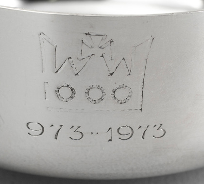 Description: An interesting sterling silver wine taster, made to commemorate 1000 years of English Monarchy between 973 and 1973. The taster is circular, set with a cast replica coin featuring King Edgar the Peaceful, with inscription "EADGARRE" between two maltese crosses, and head and shoulders of the King. The taster also has a fabulous cast silver handle, rectangular in shape with circular cut away, the handle is textured with a sun ray pattern, both top, bottom and sides, this has a lovely feel in the hand. The taster also has a circular foot, and engraved crown above 1000 and the dates 973-1973. It is a good weight and size, it holds 175 millilitres, so is a good size. King Edgar the Peaceful was crowned at Bath in 973, it was the first British coronation ceremony, other British Kings pledged allegiance. He strove successfully to unite the English and Danes, he also recalled St Dunstan from exile and made him Archbishop of Canterbury. The hallmarks are clear, including makers mark GGM, thers is slight wear to the first G. Grant Macdonald is one of the 50 Leading Designer Silversmiths featured in the book "Designer British Silver, 1930-1985" by Andrew & Styles pages 312-319, a book we highly recommend. He was Prime Warden of the Worshipful Company of Goldsmiths in 2008, his court cup (page 313) is one of our favourite silver items. Grant Macdonald is today one of London's most successful silversmiths, he employs over 20 staff, and exports 93% of his output, mostly luxury gifts for the Middle East market (see www.grantmacdonald.com). He produces silver for Aston Martin (retailed in Harrod's Luxury rooms), he also made the silver casket presented to Nelson Mandela (Freedom of the City of London). He has won the Queen's Award for Enterprise, International Trade and has a Royal Warrant from HRH Prince of Wales. The Pearson Collection (www.pearsonsilvercollection.com) has 6 items made by Grant Macdonald.