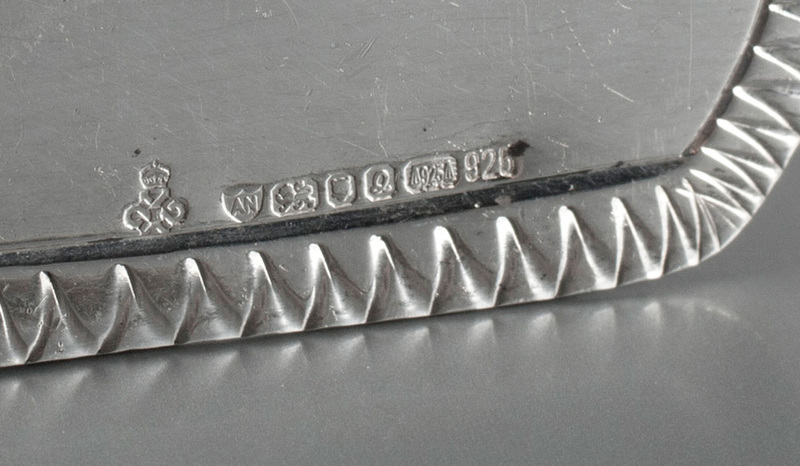 Description: A set of six sterling silver place card holders, all containing a very rare hallmark, the Queen's Award for Export Achievement. The holders are rounded rectangular in shape, with a zig-zag border, with supporting circular foot and holder to hold the place card in place. The front of the holders is blank, designed for personalised engraving, these have never been engraved. All 6 holders have 7 hallmarks, all clearly struck, including marks for London 1990, along with makers mark AN in shield, the sterling silver convention hallmark (scale with 925), additional 925 standard mark, and a rare and unusual 7th hallmark, the Queen's Award for Export Achievement (Royal Crown above cog device, with centre letter E). Ari Norman was the first British silversmith to be granted this award in 1989, he was then allowed to use the hallmark in 1989 and 1990, as per these pieces. The Queen's award was established in 1965, and still operates today. We are not aware of any other silversmith who has won this award, hence the scarcity of this hallmark. Ari Norman (see www.aridnorman.com) is a 4th generation family business, and is the largest client of the London Assay Office, so a prestigious firm.