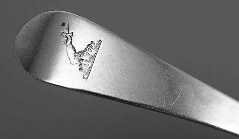Description: A rare Cape silver sauce ladle, in the Old English pattern, made by Johannes Combrink circa 1820. The ladle has a long drop, which given the date shows it's Colonial nature, and has nice proportions. It is engraved with an attractive family crest, a bent raised arm holding a dagger, this is very crisply engraved. The ladle has 2 makers marks, both clearly struck, (Welz mark 31). Johannes Combrink was born in the Cape in 1781, he married Aurelia Lotter in 1807 and died in 1853. He worked from Dorp Street.
