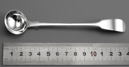 Description: A rare Cape silver condiment ladle, the only one we have encountered. The ladle is Fiddle pattern, similar in shape to a salt spoon, but with a long elegant handle, 3 to 4 cm longer than a saltspoon. The hallmarks are clear, the Cape Stub mark with 4 pseudo English marks, and makers mark FW. The stub mark is slightly worn at the bottom, the makers mark is clear. Waldek had a long career in the Cape between 1830 and 1877, he took over Twentyman's shop on the Heerengraght in 1836.