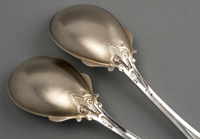 Description: A beautiful pair of sterling silver fruit serving spoons, made by Bailey & Co of Philadelphia between 1871 and 1878. The spoons have bright cut bowls which are gold washed, the handles also have a lovely design with palm leaves, we have not been able to identify the pattern (assistance welcome). The spoons have engraved owners initials MII in fancy script. The hallmarks are clear on both spoons, "STERLING PAT 1871, 1A, BAILEY & Co." The bowls also have an additional hallmark, an ornate shield with fancy design. Bailey & Co worked between 1832 and 1878 when they became Bailey, Banks & Biddle, they still exist today. Joseph & Charles Bailey are remembered for excellent quality, these spoons are no exception. The firm claimed the distinction of being the first to introduce the sterling 925 British standard to the American public, at the time the standard was 900 (Rainwater, Encyclopedia of American Silver Manufacturers, page 33).