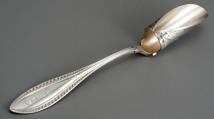 | Whiting Indian Pattern Sterling Silver Cheese (Stilton) Scoop - Gold Wash, Bright Cut, Retailer N Harding & Co, Boston, Designer Charles Osborne