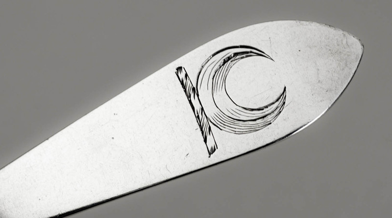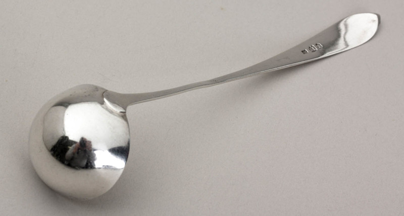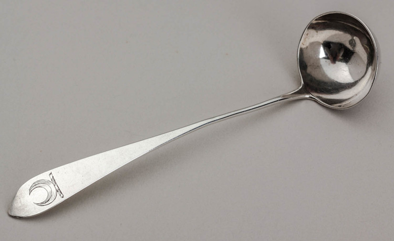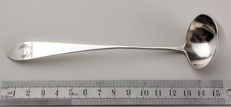 Description: A Scottish Provincial silver toddy ladle in the Celtic Pointed pattern, which was only produced in Scotland and Ireland. The ladle is lovely, long elegant handle with circular bowl, and an original engraved family crest of a crescent. The ladle has 3 hallmarks, makers mark RK in rectanglar punch, Edinburgh 3 tower town mark, and a triple cusped Georgian duty mark. We are not sure if these are official or pseudo hallmarks, the Town mark looks a little suspicious, with irregular punch on top, and it should be accompanied by the thistle and date letter if it was struck in Edinburgh. The duty mark with triple cusp is a well made punch so could be genuine, and the makers mark looks a little crude. It could be Robert Keay of Perth but sent to Edinburgh for assay, but we feel these marks are suspicious, so possibly Robert Keay using pseudo marks or another silversmith altogether. Most Robert Keay silver has his eagle mark, but he did sent some silver to Edinburgh for assay. He is known to have used a triple cusp duty mark (Turner, Scottish Provincial Silversmiths & their marks, page 85, illustration PE31), but this combination of marks is unknown. This ladle needs further research, all opinions welcome, thanks. We have now identified the family crest described as "a crescent, parted per crescent", this is the crest of the Kimpton family, and is depicted in the book "Fairbairn's Crests", plate 40 no 15, and described on page 271.