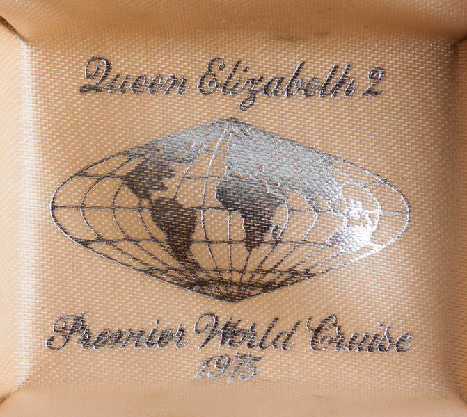 Description: A Queen Elizabeth 2 1975 Round The World Maiden Cruise sterling silver commemorative medallion, in it's original box. The medallion shows the QE2 ship on a globe with lines of longitude and latitude, the reverse has a map of the world showing the route, with the port of calls as follows: "SOUTHAMPTON / CHERBOURG NEW YORK / PORT EVERGLADES CURACAO / SALVADOR BAHIA RIO DE JANEIRO CAPE TOWN / DURBAN MOMBASA MAHE SEYCHELLES BOMBAY COLOMBO, and continuing below: SINGAPORE BALI HONG KONG KOBE YOKOHAMA / HONOLULU LOS ANGELES ACAPULCO BALBOA / CRISTOBAL CARTAGENA PORT EVERGLADES / NEW YORK CHERBOURG / SOUTHAMPTON". The QE2 visited 23 ports in 92 days during the maiden voyage, it served from 1969-2008. This medallion is catalogued as Laidlaw 0616. The medallion is clearly hallmarked on the rim, YM for Yorkshire Mint, who specialised in commemorative medallions in the 1970's. The medallion also has a Birmingham anchor hallmark separately on the rim, but no edition number (which we have noted on other QE2 medallions).