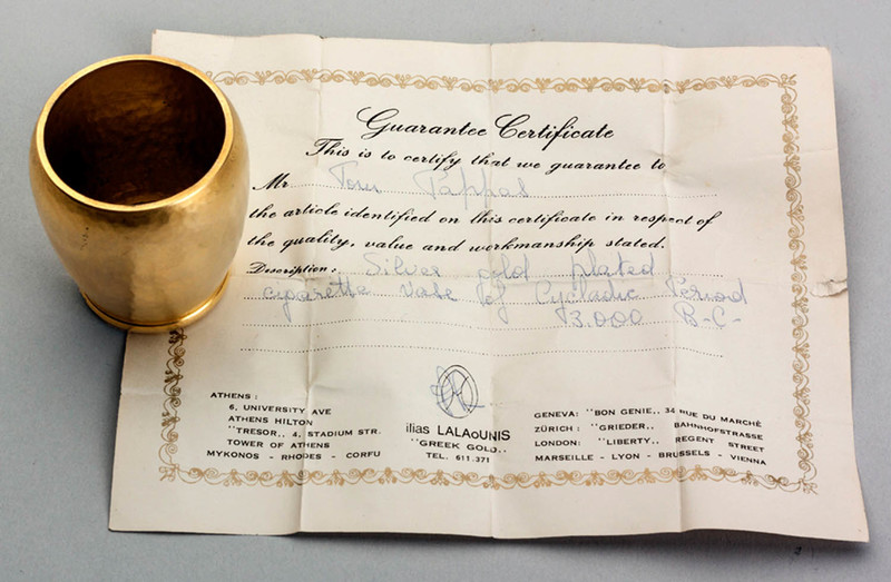 Description: An Ilias Lalaounis "Greek Gold" Arts & Crafts silver beaker, in 900 silver and gilded with a deep golden colour, with hand hammered planished surface. The beaker is a delight to hold, it is bulbous in shape, with flat bottomed base. This beaker (or small vase) is part of Lalaounis's Archaeological collection, where he made replicas of ancient Greek art, this piece dates to the Cycladic period, 3000B.C. The beaker is clearly hallmarked with Lalaounis makers mark and 900 silver standard mark. The beaker is also accompanied with it's original guarantee certificate, where it is described as a "silver gold plated cigarette vase of Cycladic Period 3000 B.C." This certificate shows a number of Lalaounis outlets, Athens, Mykonos, Rhodes and Corfu in Greece, but also Geneva, Zurich, Liberty's in London Regent Street, France, Vienna and Brussels - showing how successful Lalaounis was. Lalaounis opened a store in New York in 1979, so we know this certificate predates 1979. Wikipedia records that Lalaounis was internationally renowned, famed for his historical Greek collections, in 1990 he became the only jeweler ever to be inducted into the Acadamie des Beaux-Arts. In 1994, he founded the Ilias Lalaounis Jewelry Museum, located under the Acropolis, in the center of Athens, which is still a popular destination today - he died in 2013.