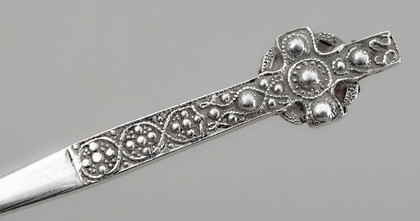 Description: A rare Oban silver pickle fork with Iona style St. Martin's Cross finial, made by Robert Lindsay in Oban in 1929 and hallmarked in Sheffield. The fork has splayed fat tines, so ideal for pickles or cold meats. The hallmarks are clear, and include makers mark RL in 2 circular punches, and "R.LINDSAY, OBAN". Lindsay is only recorded for 2 years between 1927 and 1929, we assume the tourist trade was insufficient to support him, so his silver is rare (as is all Oban silver, see our butter knives by Drummond S 1931). He produced small spoons, knives and forks, all with Iona crosses, alongside napkin rings. We welcome additional information on Robert Lindsay, this is a beautiful fork, he deserved to flourish!