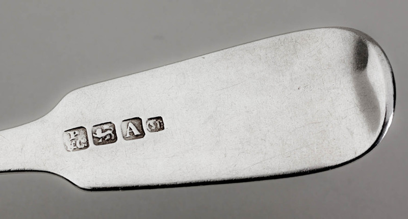 Description: A Indian Colonial silver tablespoon in the Fiddle pattern, slightly larger and heavier than most tablespoons. Ths spoon has a good feel, nicely weighted when used, and clearly hand made. The spoon has no engraving, or any sign of engraving being removed. The hallmarks are clear, and include makers mark P&Co. for Pittar & Co, pseudo lion passant, pseudo date letter A and tally mark number 17 from the book "Indian Colonial Silver" by Wynyard Wilkinson, page 170. Arthur Pittar & Co. worked between 1825 and 1848 in Calcutta, a similar tablespoon, but 2 centimetres shorter, is depicted on page 104. They were primarily diamond and jewel merchants, but clearly made good quality flatware and holloware. They imported a die press for manufacture of Fiddle pattern flatware in 1842, we believe this spoon predates that, given it's unusual size.