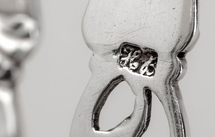 Description: An interesting pair of cast silver sugartongs by Hester Bateman, the most famous 18th century female silversmith, she has also been described as the Queen of British silversmiths. The tongs are bow shaped, with attractive cast silver pierced arms, decorated with foliage, scrolls and flowers, and shell grips. The bow is shaped, and has a cartouche for owners initials, which has not been engraved. The side of the bow has faint remnants of owners initials, P/IM, now very worn. Cast sugartongs followed scissor style sugar nips (also called tea tongs), most date between 1770 and 1780, when they were replaced by standard sugar tongs. Cast sugar tongs were complex to make, the arms were cast separately and then soldered onto the bow (Hodges, Georgian Silver Sugar Tongs, page 11). This particular tongs was made from 5 separate pieces, the bottom thinner portion of the arms were cast separately, all the solder joints are visible. We believe this is how the tongs were originally produced, there is a possibility they were later adapted. The tongs are clearly hallmarked with makers mark HB in script and lion passant, in the usual place, this is how tongs were hallmarked prior to 1784 (when the duty mark was introduced).