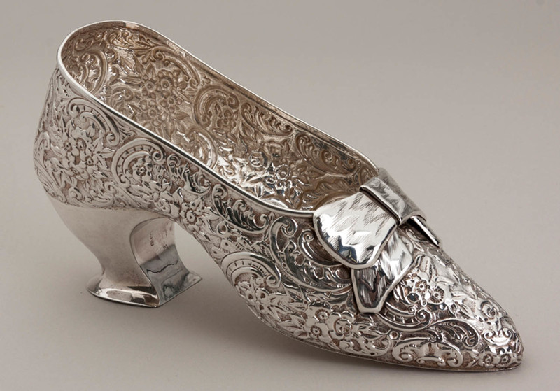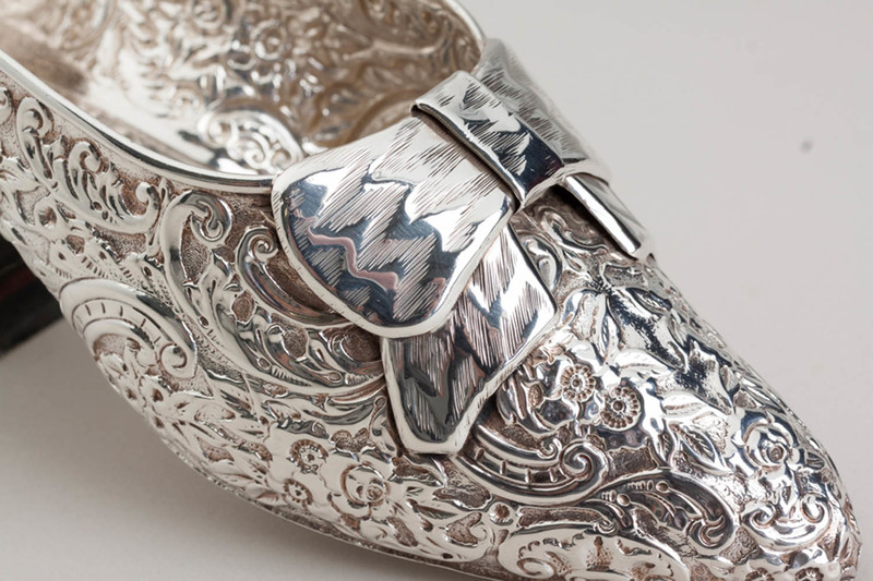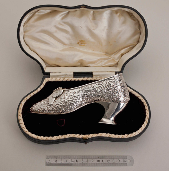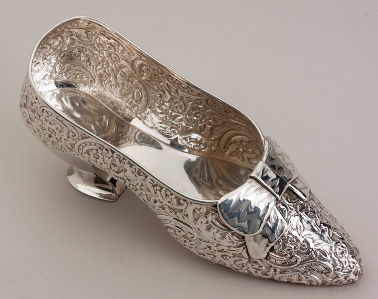 Description: An antique sterling silver shoe, we hesitate to call it miniature as it is almost real size, perhaps a child's size, we assume originally intended as a sugar bowl. It is in the traditional form as silver miniature shoes, a replica of a 16th century court shoe, profusely decorated with flowers, leaves and scrolls, with a bow on the front, and shaped heel at the back. it has been well preserved in its original box (silk and velvet, a good quality box), the box reads "Cutler Jeweller Jersey". The shoe is clearly hallmarked, the hallmarks hidden in the decoration but clearly legible, the base of the heel is also hallmarked. JF Cutler was a prestigious Jeweller who operated from 2 Queen's Street (still a jeweller today trading as Goldsmiths), he is known to have been there between 1900 and 1920.