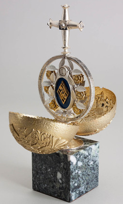 Description: A limited edition (no. 12 of 100) silver gilt Commemorative Coronation or Sovereign's orb, made to celebrate the wedding of Charles and Diana in 1981, commissioned for a Royal Family event, and made by leading silversmith Christopher Lawrence. The textured gilt orb is surmounted by the cross, and the orb is decorated with the armorials of Charles and Diana, the orb rests on a baluster support mounted on a polished green marble base, with felt base. The orb opens in half on 2 hinges to reveal back to back ovals on blue and red backgrounds with their family crests, beneath letters C and D, surrounded by cast gilt roses and silver leaves. The cross rises and falls slightly to open and close the globes. The interior circular frame is clearly hallmarked, and the interior of one globe is stamped "12/100". Christopher Lawrence is one of the 50 leading silversmiths in the book "Designer British Silver 1930-1985" by Andrew and Styles, in fact his work is featured on the main cover of the book (Reed Warbler Candelabra). He is the only silversmith to win three coveted Jacques Cartier Awards (for Silversmith of the Year), he is best known for texturing, a key feature of this orb. He produced a range of collectible mushrooms that revealed a surprise, including one designed to commemorate the Charles and Diana wedding, this is far commoner than this Orb, which rarely appears on the market, as it was commissioned by the Royal family for a specific event. Lawrence worked for 56 years and retired in 2011, and "will long be remembered for the many magnificent pieces he has created" page 293, British Designer Silver. The Pearson Silver collection has 22 different items made by Lawrence, a testament to his skill.