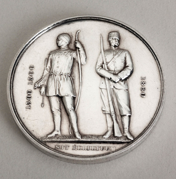 Description: A National Rifle Association 1860 Silver trophy medallion, which would have been awarded as a rifle shooting trophy. The obverse has 2 soldiers, the first a British longbow man with dates 1300-1500, the second a rifleman dated 1860, above motto "Sit Perpetuum" - translated "May it last forever". The reverse has a laurel wreath surrounding "The National Rifle Association 1860". The medallion is excellent quality, and in excellent condition, without any engraving, so perhaps it was never presented. The hallmarks are clear, and include makers mark E&Co for Elkington, who are known for their superb quality. The National Rifle Association of the United Kingdom is a registered charity with a Royal Charter, whose charitable objectives are to promote and encourage marksmanship throughout the Queen’s dominions in the interest of defence and the permanence of the volunteer and auxiliary forces, naval, military and air. The formal purposes of the charity are to promote the efficiency of the armed forces of the Crown, or the police, fire and rescue or ambulance services. The National Shooting Centre at Bisley is a wholly owned subsidiary of the Association (source wikipedia).