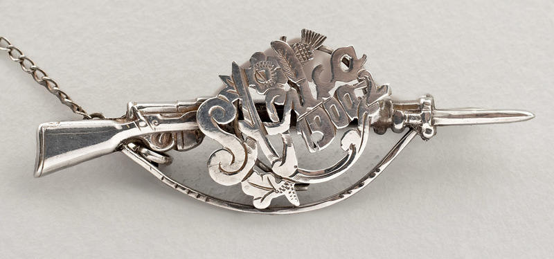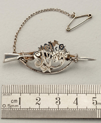 Description: A Boer War antique silver sweetheart brooch, that reads "S Africa 1900-2". The brooch has a realistically modelled Lee Enfield rifle with hanging strap, with applied circular pierced badge, which also features the English rose, Welsh leek and Scottish thistle. The brooch has a pin clasp (note pin has an old repair where it has been re-soldered onto the rifle), it also has a detachable chain with hanger shaped safety pin, to prevent the brooch being lost. The back of the rifle is clearly hallmarked for Birmingham 1901/2, with makers mark WL, in 2 shields, for William Light who worked between 1895 and 1912.