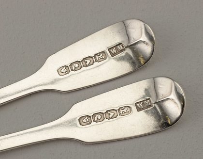 Description: A lovely pair of Cape silver konfyt (preserve) forks in the Fiddle pattern with 4 tines, the forks are in excellent condition and have no engraving. Both forks have clear hallmarks, makers mark W.M and the Cape Stub mark (see our articles section) consisting of 4 English pseudo hallmarks, Lion passant, date letter capital A, Georgian kings head duty mark and leopards head (town mark for London).This is mark 100 in the book Cape Silver by Welz, except the makers mark he depicts does not have the dot between the W and M, which shows Moore had at least 2 different punches. Konfyt forks are typically Cape, they were made and sold as individual items, and are described by Welz as "having a great deal of charm" (pg 65, Cape Silver, Welz). William Moore was a goldsmith and jeweller who worked between 1840 and 1863 from St Johns Street, Cape Town, Parliament is located on St Johns street so it was a prestigious location.