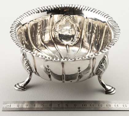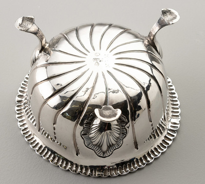 Description: A Georgian Irish silver sugar bowl, made by Charles Townsend in Dublin around 1780. The bowl is circular with a fluted design and a flat fold over gadrooned rim, supported by three cast silver shell knuckle hoof feet, we love these feet. The base of the bowl is engraved with original owners initials P over M M, this is alongside the hallmarks. The bowl is clearly hallmarked with the Irish Hibernia and Crowned Harp, next to makers mark CT for Charles Townsend, who worked in Dublin between 1773 and 1790. This is a large bowl, more suitable today for bon-bons, it will hold a lot of sugar! The size and design is typical of the period for Irish silver, a number of other examples have survived. A similar shaped bowl but with different design, but with identical feet, now in the National Museum of Ireland. can be seen in a colour photograph in the book "Collecting Irish Silver" by Douglas Bennett (a book we highly recommend), page 63 and 65. The Metropolitan Museum also has a very similar fluted bowl, also by Charles Townsend with similar hallmarks, dated 1770-1785, see ref 197720 on their website. Whilst we love this design, we must point out that the fold over flat rim is clearly a weak point, susceptible to splits. The rim has 5 old repairs, visible from underneath, and done at the same time by the same silversmith, these have been well done, barely noticeable from the top unless you search carefully with a magnifying glass. The bowl has subsequently acquired 2 additional splits, the first 1.5 cm, the second 1 cm along side an old repair.