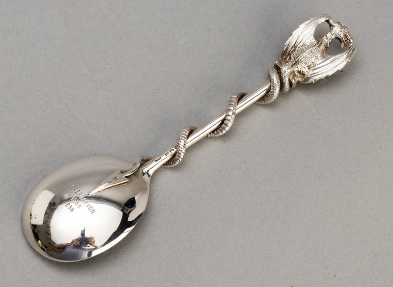 Description: A fabulous Royal silver souvenir spoon, of outstanding quality, commemorating the investiture of the Prince of Wales (now King Charles III) in Caernarvon, Wales in 1969. The spoon has a cast silver Welsh dragon holding a Royal shield, the dragon's tail curls around the spoon stem and forms a "rat-tail" on the spoon bowl, we love this spoon. The bowl has a cast silver Prince of Wales emblem, with 3 feathers above crown, above the motto "Ich Dien", translated "I serve". The back is engraved "Caernarvon 1969, 256", this was a limited edition and each spoon was numbered. The hallmarks are clear, with makers mark JDB for J.D. Beardsmore & Co, who only worked in 1969 and appear to have only produced this spoon. The Emblem inthe bowl, which is cast as a separate piece, is also hallmarked. The spoon was originally sold in a custom box with leaflet, the leaflet informs that the spoon was designed by Norman Manwaring, Herald Painter to the College of Arms, under the supervision of R.O. Dennys, OBE, FSA, Herald of Arms, unfortunately the box and leaflet are missing. These spoons were expensive when new, in 1969 they were sold for GBP 25, which would equate to GBP 397 today.