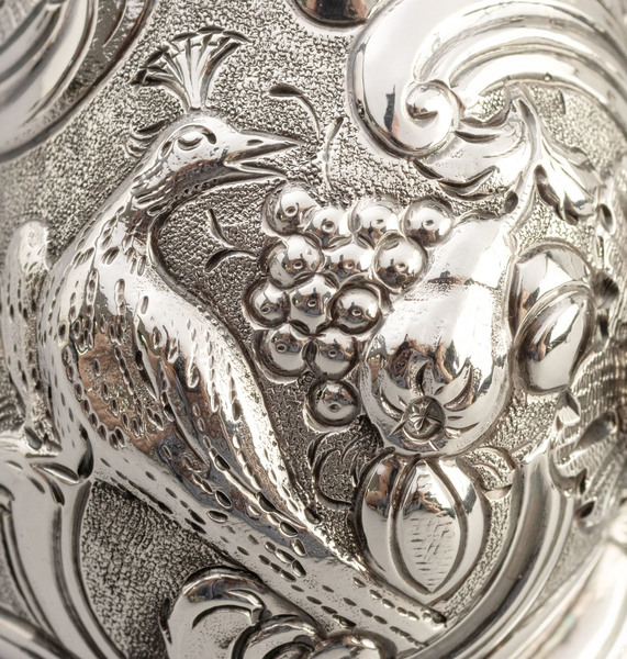 Description: A fabulous early Georgian Rococo shell shaped punch ladle, in the shape of a conch shell. The ladle is embossed and engraved in typical Rococo style with a bird (peacock?) eating fruit (grapes and a pear), alongside a brick chimney with flames? at the top, surrounded with scrolls, shells, flowers and leaves. The shape of the shell and quality of the embossing and engraving is very pleasing. The shell is connected to the silver handle base with cast silver scrolls at right angles to the shell, the handle itself is turned wooden handle. The ladle is held hanging vertically, the the shape of the shell and pouring lip makes it very practical to use. The base of the handle is engraved with original owners initials A over T.T. The ladle is hallmarked with London hallmarks for 1752, and makers marks PR for Philip Roker II (Grimwade mark 3754). As all 4 marks are struck on a curved surface they are all unevenly struck, clear on the right but slightly obscured on the left, all visible enough but the makers mark could be PR or FR, we believe it to be PR. The rococo style was popular in England between 1730 and 1760, Paul de Lamerie was one of the leading proponents. Philip Roker II worked between 1720 and 1757. His father and son were also silversmiths. A very similar shell punch ladle is depicted in the book "Investing in Silver" by Eric Delieb, page 38, this example London 1744 by Edward Aldridge, described as "rocaille sea shell with matt chased enrichment, boxwood handle". Note 1 - A very similar punch ladle, also London 1752 by Philip Roker, is photographed in the book "Silver for Collectors" by Eleanor Hughes, page 91, she describes it as 'some-what unusual, the bowl formed as a shell is chased with scrolls, flowers and rocaille ornament".