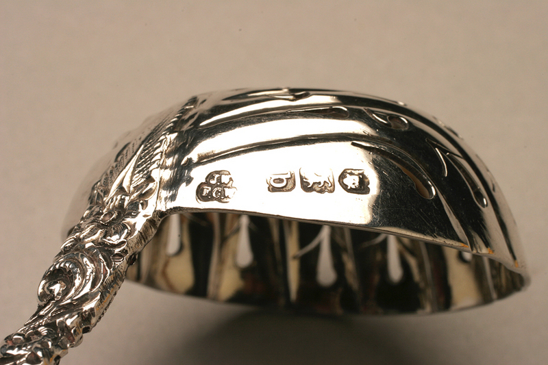 Description: Typically late Victorian sugar sifter with ornate cast handle depicting flowers and foliage, and gilded bowl. Hallmarks very clear.