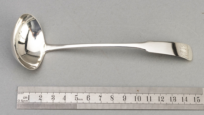 Description: A Scottish Provincial silver Toddy ladle in the Oar pattern, which is a scarce variant of Fiddle pattern (Fiddle without shoulders), only found in Scotland (Pickford, Silver Flatware, pg. 111). The ladle was made by Peter Lambert in Aberdeen, and is engraved with original owners initials RMR in script. The ladle has 3 hallmarks, makers mark PL between 2 thistles, these marks are well struck but blurred, so we assume the punches were worn. The thistle punch has a noticeable indent on the left hand side. Peter Lambert was born in Aberdeen, as was admitted to the Hammermen in 1804. He left Aberdeen in 1813, and subsequently moved from town to town looking for work, he is known to have worked in Dundee, Montrose and Berwick, and had spoons assayed in Newcastle and Edinburgh (Aberdeen Silver by Michael Wilson, page 60, a book we highly recommend).