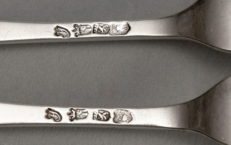 Description: A pair of Dutch silver Hanoverian pattern tableforks, made in Rotterdam in 1781 by Rudolph Sondag, 'the most famous silversmith in Rotterdam, his work towered above the Rotterdam silver landscape" - source (Schadee, Zilverschatten, Drie Eeuwen Rotterdams Zilver). The forks are clearly hand made, and differ in weight - one is 75 grams, the other 71 grams. The forks have 4 tines, and are bottom marked with 4 clearly struck hallmarks - date letter Y for 1781 with a distinctive dot above one arm, Rotterdam town mark (slight wear at bottom), crowned rampant lion standard mark (934 grade so purer than sterling) and makers mark of sunburst sun in shield punch. Rudolph Sondag's makers mark usually has a face in the sun centre, this is worn on these forks. Sondag worked form 1746 until his death in 1812, he was highly productive and has left behind some magnificent silver, well represented in Rotterdam's Museum Boijmans van Beuningen. Aardewerk notes varied quality in the work he produced, and postulates he guarenteed work made by apprentices for sale in his shop which sold gold and silver items. Note - We have a matching pair S 11581.