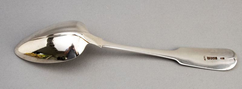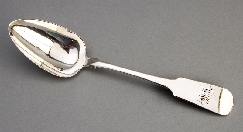 Description: An Irish silver serving spoon in the Fiddle pattern, with Rat-tail bowl, this is a feature only found on Irish spoons of this period. The spoon is engraved with original owners initials WMC in script. The hallmarks are clear, including makers mark TT without pellat, this mark was only used by Townsend in 1816 and 1817. The hallmarks are clear, and include retailers mark LAW for Willaim Law, who operated in Dublin from 1766 - late 1820's, firstly from Cole Alley, Castle street, then Sackville Street, it is known Thomas Townsend was one of his suppliers. This spoon is suitable for use as a serving spoon. Note - The hallmarks appear to have been painted over with a brown substance, possibly varnish, but they are still clearly visible. This spoon also has an additional engraved C on the drop, probably the initial of a different owner.