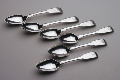 Description: A set of Indian Colonial silver Dessert spoons in the Fiddle pattern, with rare hallmarks from little known Calcutta goldsmiths. 3 spoons are by RS and 3 are by BG (both makers are listed but unidentified by Wilkinson in his book "Indian Colonial Silver"). The hallmarks are clear but a little worn, BG with tally mark 14 (Wilkinson, pg 27) and RS with the Fish tally mark (Wilkinson, pg 116). Tally marks are thought to be the mark of the indigenous workman who finished the piece. The tally mark 14 also appears on silver from Twentyman & Co. This set was probably put together when new in Calcutta circa 1830, as they all have the same initials DI, exhibiting some wear. Given the differential wear to the bowl tips, we can only assume that the 3 by BG are softer, higher grade silver than the 3 by RS.