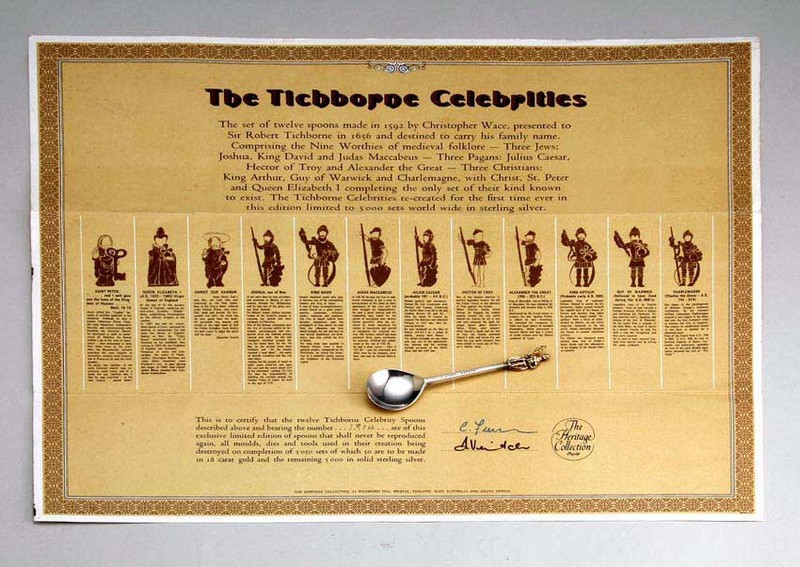 Description: A scale replica set of the Tichborne Celebrities, probably the most famous of all English spoon sets, originally made by William Cawdell in 1592 (Kent, London Silver Spoonmakers). The set was produced in 1977 by the Heritage Collection of Bristol, commemorating the Silver Jubilee, in a limited edition of 5000 (this set is no 1814). The sets sold for GBP 250 in 1977, with a royalty paid to the Hampshire County Museum, who bought the original set at Christies in 1975 for GBP 85000. The spoons are sterling silver with gilt finials, and each spoon is hallmarked with 5 marks - makers device, STG (sterling), antelope head (South Africa), date letter D and set number 1814. The spoons are good quality, with very detailed finials, and each is engraved with its name, as per the originals. The set comes in original box, complete with signed certificate with information on each "celebrity", and a booklet describing the set, its maker, and information on Sir Robert Tichborne. The set comprises of the "9 Worthies" of medieval folklore - the Three Jews (Joshua, King David, Judas Maccabeus), Three Pagans (Julius Caesar, Hector of Troy, Alexander the Great), and Three Christians (King Arthur, Guy of Warwick, Charlemagne) and is completed by Christ, St Peter and Queen Elizabeth I (who was on the throne when the original spoons were made). The original spoons were presented to Sir Robert Tichborne in 1656, when he was Lord Mayor of London. He was one of the judges who signed the death warrant of King Charles I.