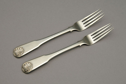 Description: A delightful pair of Cape silver Konfyt forks, in the rare Fiddle and Shell pattern. The forks also have a bevelled edge, and are single struck. Fiddle and Shell pattern is scarce (Pickford, Silver Flatware), Cape silver in this pattern is very rare. The hallmarks on both forks are very clear, being makers mark MLS between 2 Fleur de Lys. Smith was a Dane who arrived in the Cape in 1757. He married 4 times, had 10 children, and died in 1806 (Welz, Cape Silver).
