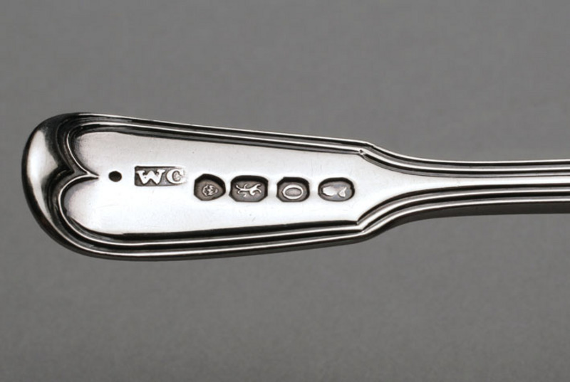 Description: A matching set of crested Georgian silver flatware, including 12 tablespoons, 2 sauce ladles, 2 saltspoons and butterknife, all of very good gauge and quality. The pattern is Fiddle and Thread, and all pieces have an interesting double crest, indicating a marriage between 2 noble families. The first crest is of a head and shoulders of a bearded man with unruly hair, the second a raised fist holding a halbeard. The saltspoons have gilded bowls to prevent corrosion. The butterknife is a later addition to the set (made in 1895), and only has the bearded man crest. The makers mark on the butterknife has been removed, possibly to allow the retailer to overstamp. Chawner was a prolific spoonmaker, he ran a large workshop of journeymen, whose individual marks can be seen on the spoons (devices include stars, bars, circles and triangles).