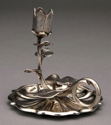 Description: A delightfully decorative chamberstick, realistically modelled as a flower bud, stem and leaves, one of the finest chambersticks we have seen. The flower stem forms the ring grip, and the bud holds the candle, and the pan is octagonal. It is beautifully made and decorated, and is very good quality - truly the work of master craftsmen. Chambersticks were traditionally used to light your way to bed at night. The Angell's are described by Pickford as "very fine 19th century family of goldsmiths" (Jackson's Hallmarks). The hallmarks are clear, and include the duty mark of William IV (even though Victoria was already on the throne), indicating this piece was made between 29 May and 20 June 1837. Both the pan and one of the leaves are hallmarked, even the silver wingnut underneath is hallmarked. The makers mark is poorly struck and only partially visible, but sufficient can be seen to leave no doubt as to the makers identification.