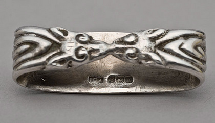Description: A rare Iona silver scarf ring, in the Celtic Arts and Crafts style. The ring is very good quality, and has a classic Ritchie Viking longship motif, with celtic knotwork side panels, and terminals of wolf like celtic beasts. The ship is copied off an 11th century stone carving in Iona's Abbey museum, and the beasts are similar to those found in the Book of Kells. The hallmarks are very clear, "AR IONA" incuse, along with makers mark ICA (Iona Celtic Arts) and Birmingham hallmarks for 1934. Ritchie registered the ICA makers mark in 1931 in Birmingham. Alex Ritchie's work was inspired by the ancient Celtic and Viking carvings on Iona. He is regarded as one of the most respected and sought after Scottish silver jewellers of the 20th century. (All information courtesy of Alexander Ritchie website, see link on our links page. A similar scarf ring is shown on the website.)