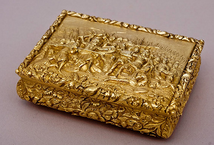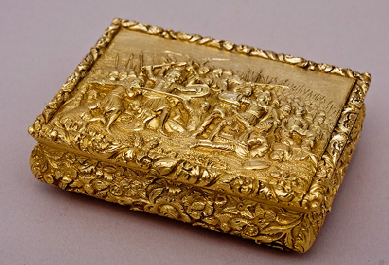 Description: A magnificent silver gilt snuffbox with a superb finely detailed battle scene. The gilding on the battle scene has different tones, the base has a deeper rich red tinge, this fades to a lighter yellow gold colour in the sky. The box is exceptional quality and a pleasing weight. The sides and rim are richly decorated with cast flowers and thistles, which leads us to believe it is possibly a Scottish battle scene (we welcome opinions!). The battle is being fought with swords, battleaxes, lances, shields, armour and horses, no sign of firearms. The detail includes a castle in the background, flags, finely detailed armour and armorials on the shield - the work of a master craftsman. The base is engine turned, and has a blank cartouche. The interior lid is engraved "Presented to Thomas Ogilvy Esqr, by the New Quay Company of Manchester, as a mark of their gratitude, for his great attention & trouble as arbiter, in the investigation of the disputed claim, made on them by Messrs Francis Philips & Sons, 1829". The engraving is also lovely, different fonts and sizes, also the work of a master engraver. The hallmarks are clear, on both the lid and the base.