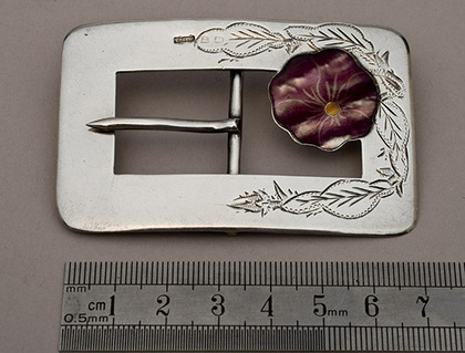 Description: A lovely silver belt buckle, decorated with a mother of pearl flower with purple, white and orange colours, which change colour as it catches the light. The buckle is also engraved with leaves and flowers in bright cut fashion. The buckle has Birmingham hallmarks, with makers or retailers mark "FHA Ld" overstriking other marks, including the date letter. FH Adams used this mark between 1908 and 1915, they worked from New John Street. Given the style of decoration and lovely mother of pearl work, it is possible the buckle is continental in origin, and received Birmingham marks after import into Britian.