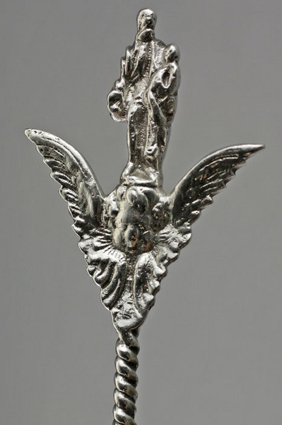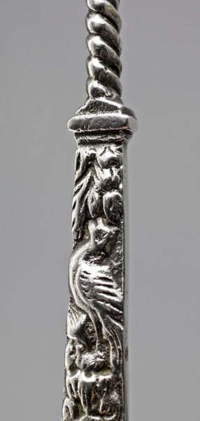 Description: A lovely pair of decorative Hanau silver Christening (or anointing) spoons, with an Apostle carrying a baby standing on a winged cherub's head. The stems are twisted, the base decorated with a peacock eating fruit, above a face. The back of the bowls are richly decorated with a diamond pattern and scrolling foliage, and the spoons have a rat tail. The spoons are cast, and as such are quite solid, with a pleasing weight. As is usual with Hanau silver, they are replica's of fine 17th century German silver.
