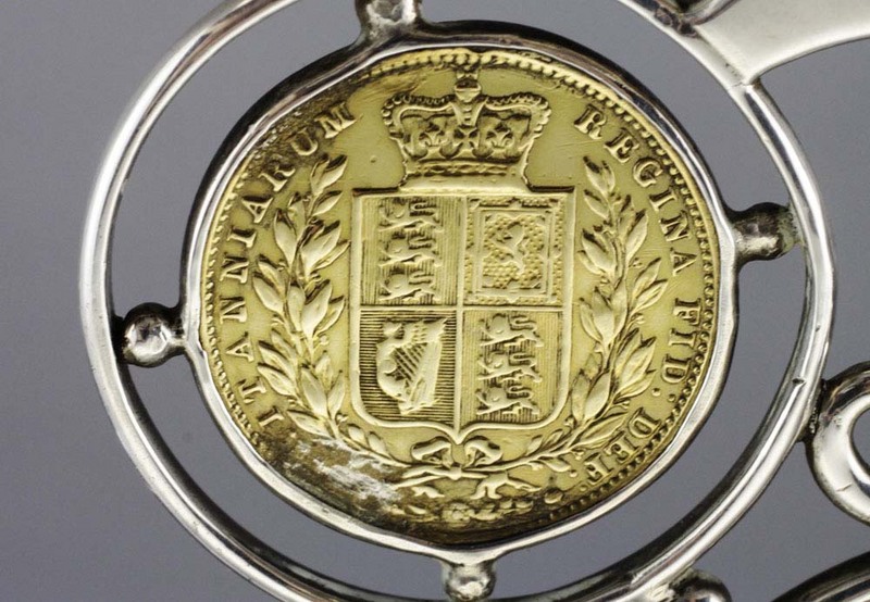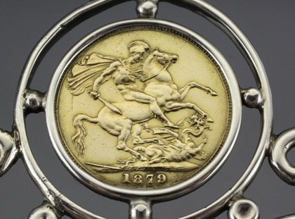 Description: A unique antique silver letter opener, with 3 gold sovereigns set in the handle, which has an attractive open scrollwork design, with a central silver ball. The handle fits well into the hand, it feels similar to holding a sword or dagger! The opener is good quality and is a good weight. Two sovereigns are Victorian (dated 1854 and 1879) and one is Edwardian (dated 1904). The sovereigns are aligned by the date letters, all at the base on the same side, indicating the date has significance. The dates are all 25 years apart, so we assume the opener was specially commissioned to celebrate a 50th wedding anniversary, which is traditionally celebrated with gold. The couple would have married in 1854, celebrated their 25th anniversary in 1879, and their golden anniversary in 1904. We cannot imagine a nicer golden wedding anniversary present! The hallmarks are clear. Andrew Barrett & Sons worked at 63 Piccadilly between 1844 and 1970. The sovereigns are also in fine condition, they are 22 millimetres in diameter, and are 22 carat gold, weighing approximately 8 grams each.