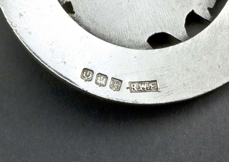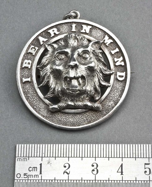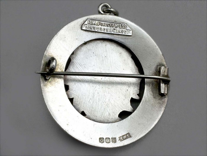 Description: A Scottish silver clan badge, which can be worn as a pendant or as a brooch or kilt sash pin. The badge comprises a "Lions Head Effrontee" (looking forward) with the motto "I Bear in Mind". This is the crest and motto of the Campbell clan of Barbreck. The Campbells are one of the most powerful clans of Scotland, descendants of King Robert Bruce. The Campbells of Barbreck are from the Argyll district. The badge is very good quality, the lion is cast and has lovely detail, it stands out from the badge. It is a pleasing weight, and hangs well from a chain. The hallmarks are clear, and include makers mark RWF. The badge also has a silver plaque which reads " R.W. Forsyth Ltd, Edinburgh & Glasgow". R.W. Forsyth was a leading Scottish department store from 1897 until the 1980's.