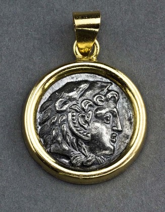 Alexander the Great Greek Silver Coin Pendant in 14 Carat Gold Bezel - Drachm, Amphipolis, 336-323 BC